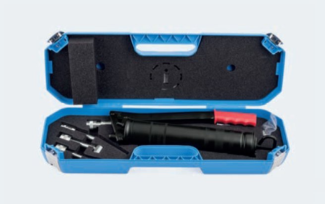 Шприц для смазки 1077600 также может поставляться в комплекте: 1077600/SET включает 3 удлинительных трубки и высоконапорный шланг, которые упакованы в футляр для переноски.