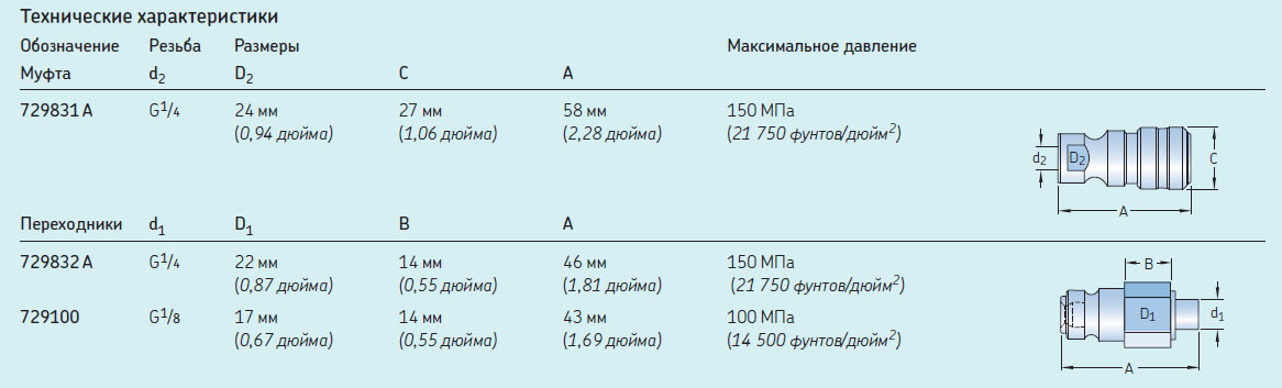 Для подключения гидравлических насосов SKF к деталям имеется один тип штуцера и два типа переходников. Если требуется установить переходник в отверстие с другой резьбой, воспользуйтесь дополнительными переходниками SKF. Переходник 729832 A поставляется со всеми стандартными гидравлическими гайками серии SKF HMV ..E.