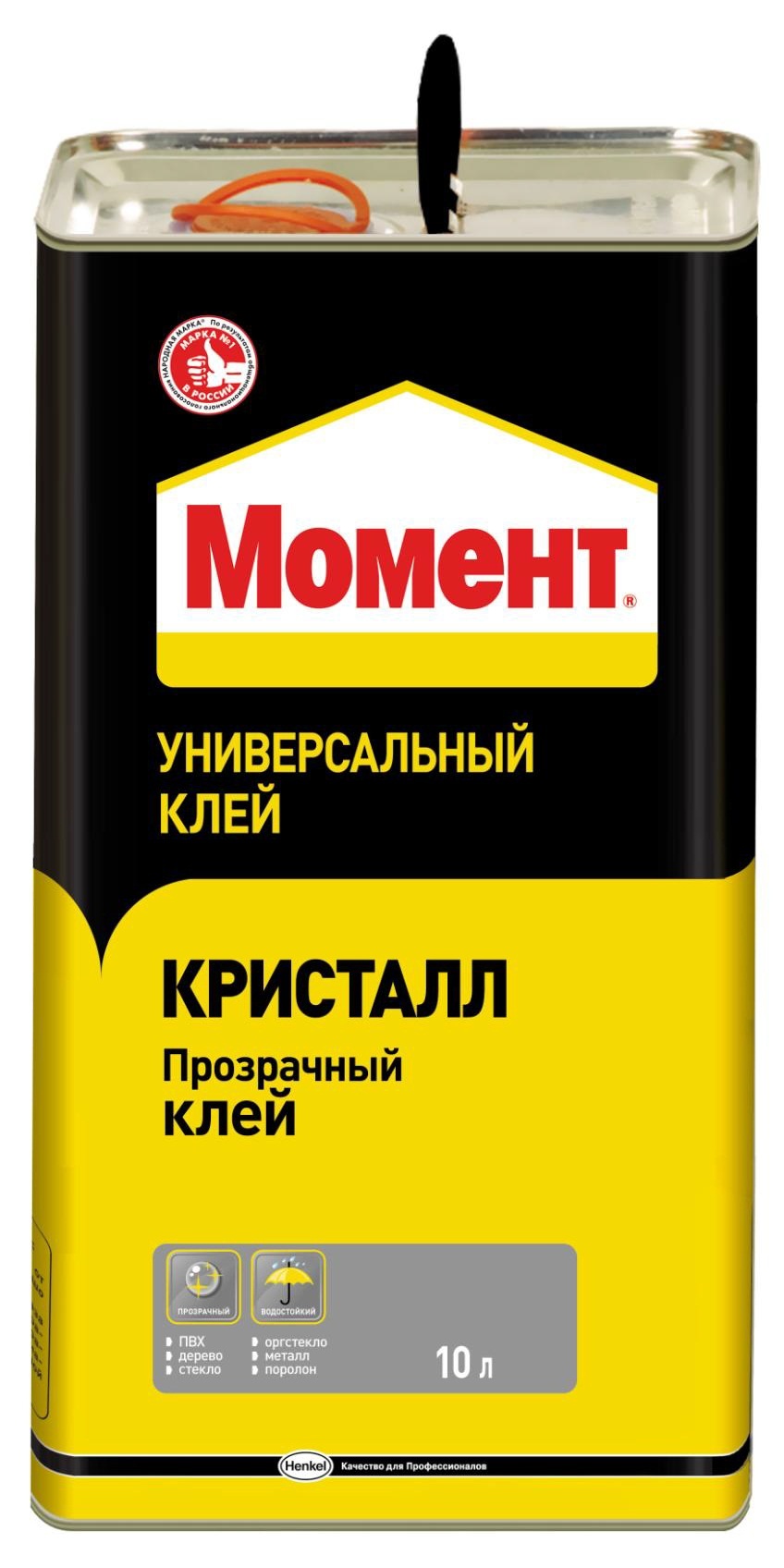 Момент Кристалл - прозрачный клей, не оставляющий заметных следов. Предназначен для работы с материалами из мягкого и жёсткого поливинилхлорида, полистирола, оргстекла и других пластиков. В различных сочетаниях склеивает дерево, металл, резину, бумагу, картон, кожу, ткань, пробку, поролон, фарфор, керамику, стекло, кроме посуды, контактирующей с пищей.
