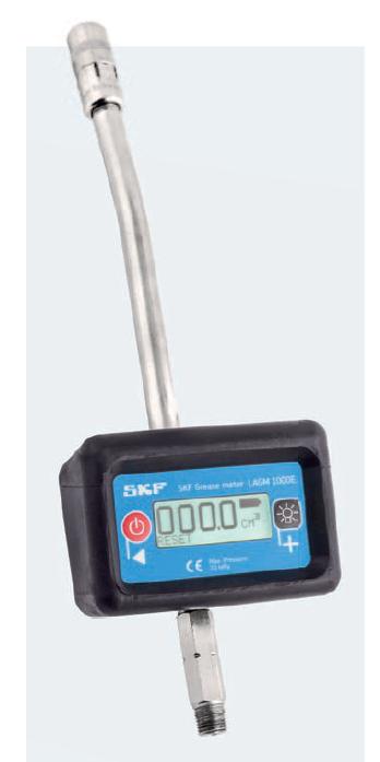 Прибор SKF для измерения количества смазки точно замеряет количество поданной смазки в единицах объема или массы как для метрической (см³ или г) так и для имперской (жидкая унция, унция) системы единиц. Прибор выдерживает давление в 700 бар, что позволяет использовать его в сочетании со многими типами смазочных шприцев и насосов.