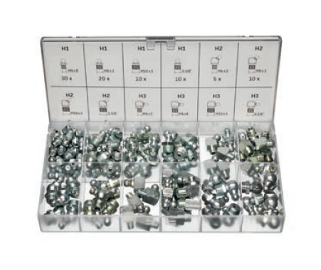 В комплект пресс-маслёнок LAGN 120 входит вся серия 120 стандартных конических пресс-маслёнок из высококачественной стали, с оцинковкой, закалкой и хромированием.