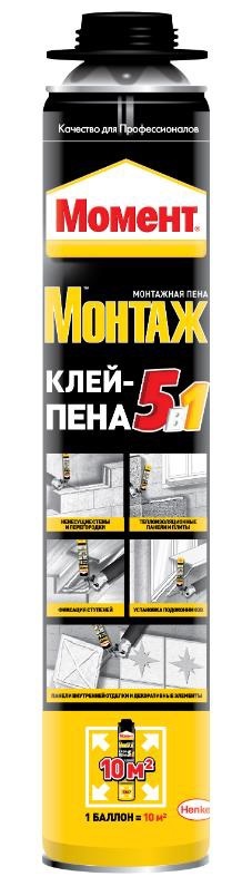 Момент Монтаж 5в1 ПРОФ клей-пена - это профессиональная однокомпонентная полиуретановая клей-пена для различных