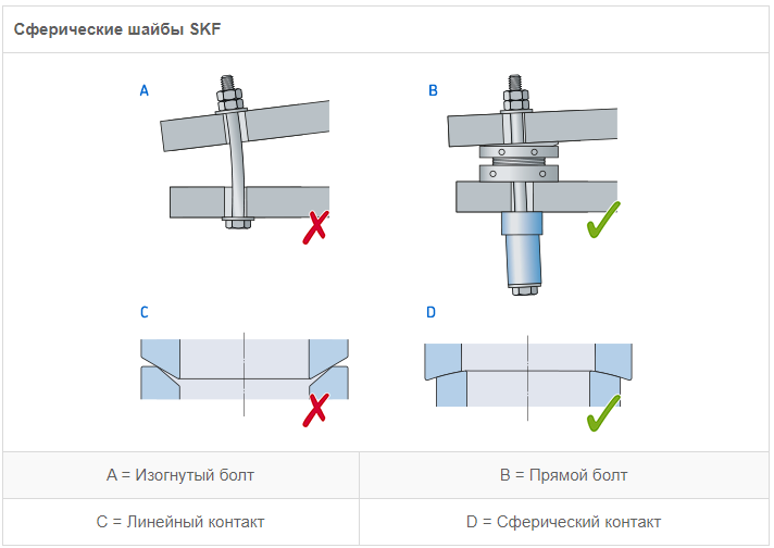 Сферические шайбы предназначены для создания точной параллельной плоскости между головкой болта и поверхностью основания гайки. Сферические шайбы SKF автоматически регулируют и компенсируют угловое отклонение между плоскостями и предотвращают искривление болта.