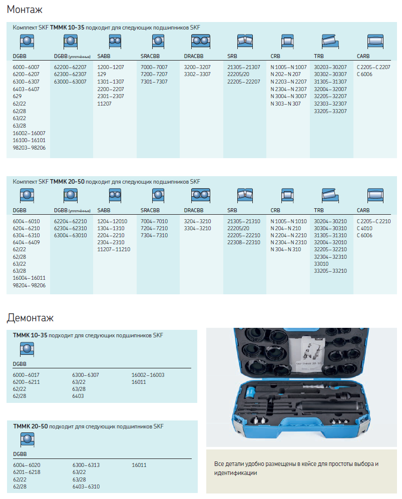 Набор инструментов TMMK 10-35 подходит для подшипников с диаметром отверстия 10–35 мм, а TMMK 20-50 — для 20–50 мм.
