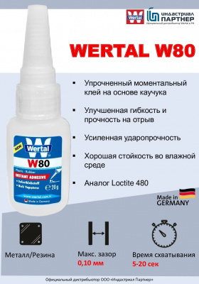 Клей WERTAL W80 – моментальный клей, разработанный для соединения трудно склеиваемых материалов, требующих равномерного распределения напряжений, высокую прочность на растяжение и / или сдвиг. Это модифицированный каучуком клей, обладающий повышенной гибкостью и прочностью на отрыв в сочетании с повышенной устойчивостью к ударам. Продукт обеспечивает быстрое склеивание многих материалов, включая металлы, пластмассу и резину. Продукт обладает хорошей стойкостью во влажной среде.